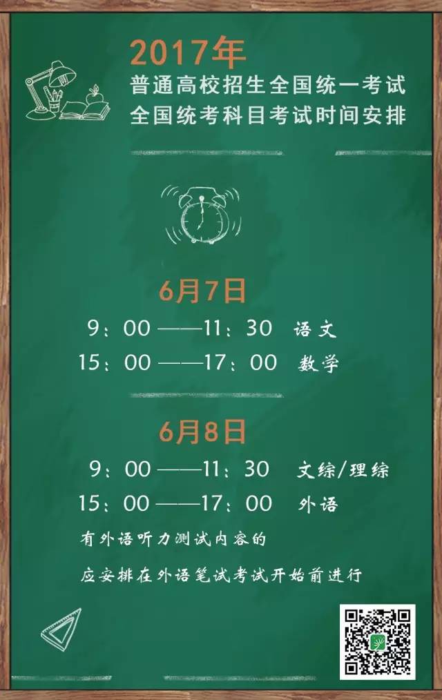 据教育部网站消息,教育部办公厅近日发布《关于2017年普通高等学校招生全国统一考试全国统考科目时间安排的通知》,《通知》称,2017年高考时间为6月7日、8日,各省(区、市)考试科目名称与全国统考科目名称相同的必须与全国统考时间安排一致。