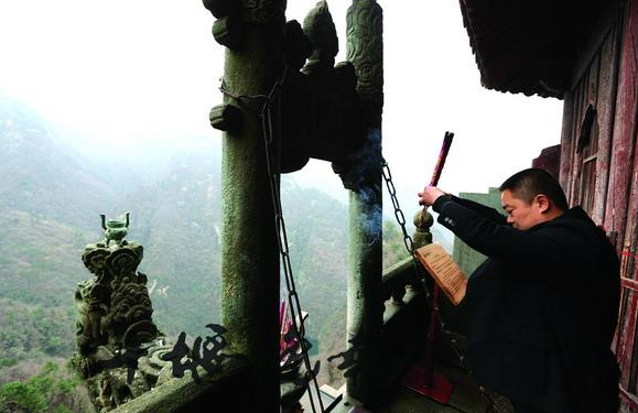 今年34岁的闵家会是武当山本地人,在南岩宫景区已经工作了16年,因胆大心细,且工作勤勉,同事们都叫他“牛哥”。他的胆大心细,在龙头香敬香仪式上充分体现出来。