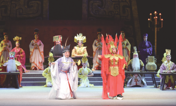“云梦泽畔老郎庙,优孟衣冠青史名。何当秉承师祖志,不负知己不负卿。”在凯乐大剧院的舞台上,绚丽的灯光、华丽的服饰、演员们惟妙惟肖的神态,都透露出楚腔汉调的精气神。
