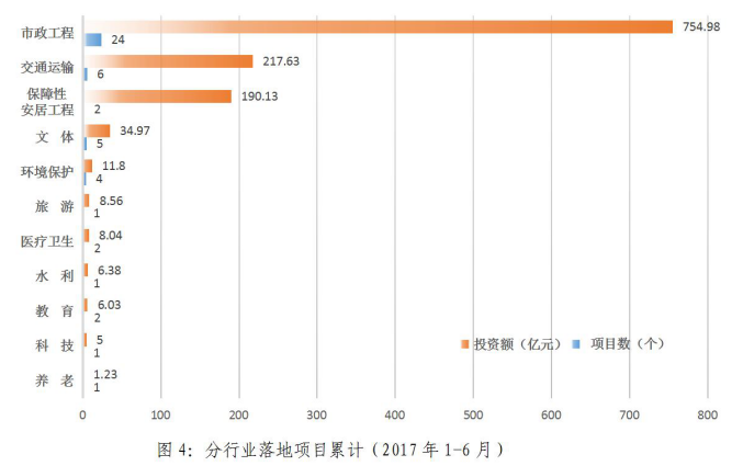 2017年1-6月,累计新落地项目投资额排名:市政工程(754.98亿元)、交通运输(217.63亿元)、保障性安居工程(190.13亿元)、文体(34.97亿元)、环境保护(11.80亿元)、旅游(8.56亿元)、医疗卫生(8.04亿元)、水利(6.38亿元)、教育(6.03亿元)、科技(5亿元)、养老(1.23亿元)。