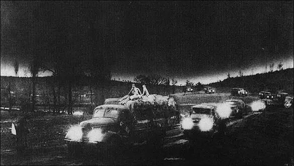 黄建华:一般200多公里吧。路太难走了,不敢开灯,还总有美国飞机扔照明弹,地面照的和白天一样,轰炸机就下来炸。开始我们怕照明弹,扔出来就赶快停车隐蔽,后来知道刚扔出来的时候,飞机还看不到下面,就借着照明弹赶紧跑。等到亮起来再隐蔽。再后来,有的车在土路上开的足够快,扬起漫天烟尘,上面就算有照明弹也看不见,所以也有胆大的司机见到照明弹不减速,反而提速,用扬尘掩护后面的司机。