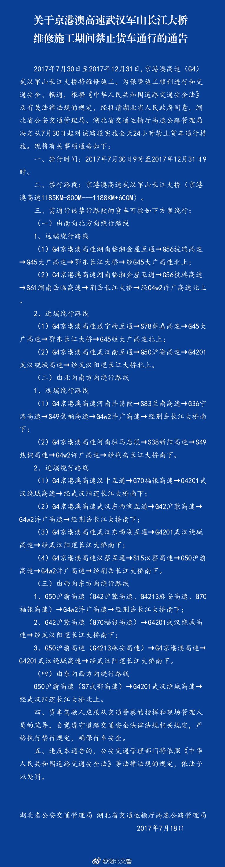 长江云报道 2017年7月30日至2017年12月31日,京港澳高速(G4)武汉军山长江大桥将维修施工。为保障施工顺利进行和交通安全、畅通,根据《中华人民共和国道路交通安全法》及有关法律法规的规定,经报请湖北省人民政府同意,湖北省公安交通管理局、湖北省交通运输厅高速公路管理局决定从7月30日起对该路段实施全天24小时禁止货车通行措施。现将有关事项通告如下: