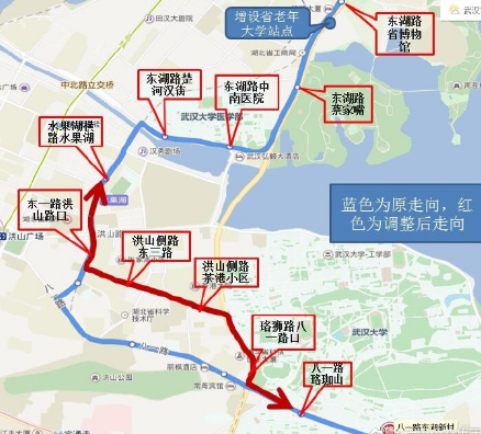 首末站不变(首站三眼桥路元辰世纪,末站八一路东湖新村),中途走向由原八一路、东一路、水果湖路、东湖路调整为八一路、珞狮路、洪山侧路、东一路至水果湖路恢复原线,填补洪山侧路附近居民往中南医院、省老年大学、东湖绿道方向的出行空白。