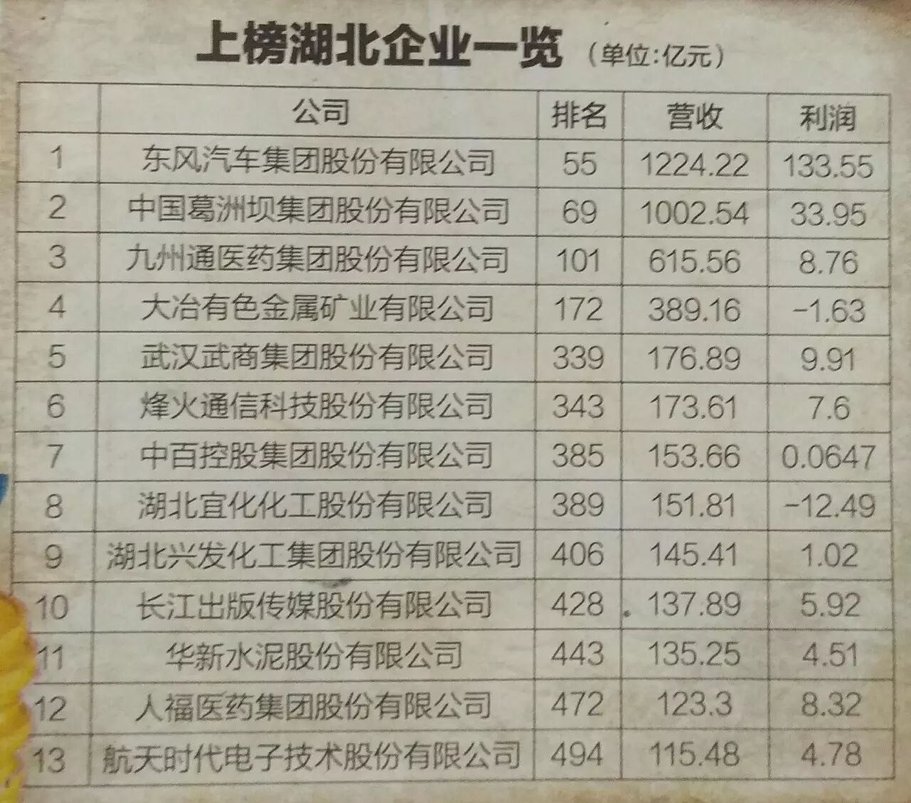 《财富》中国500强排行榜,该榜单由《财富》(中文版)与中金公司财富管理部合作编制,考量了全球范围内最大的中国上市企业在过去一年的业绩和成就。其中,湖北省有13家企业现身该榜单。