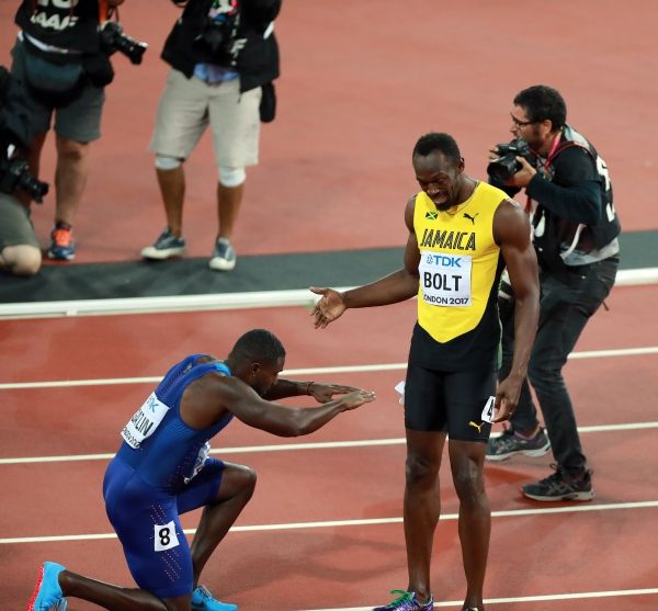 △获得冠军的美国选手加特林(左)向传奇人物“闪电”博尔特单膝跪地致敬。新华社记者罗欢欢摄