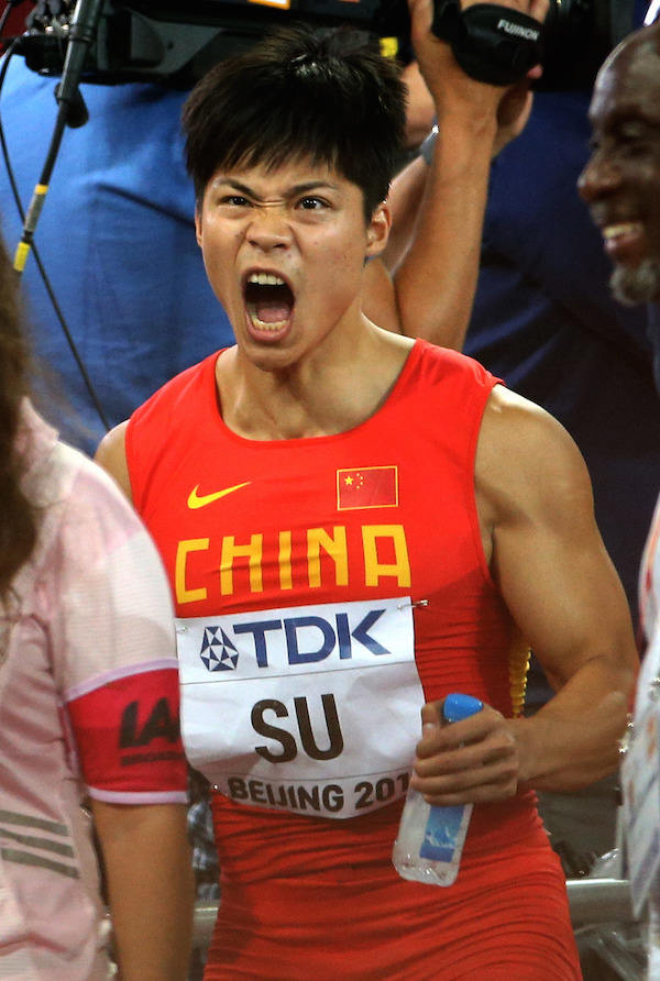 △图为在北京田径世锦赛上,苏炳添得知自己晋级决赛后呐喊庆祝。新华社记者李明摄