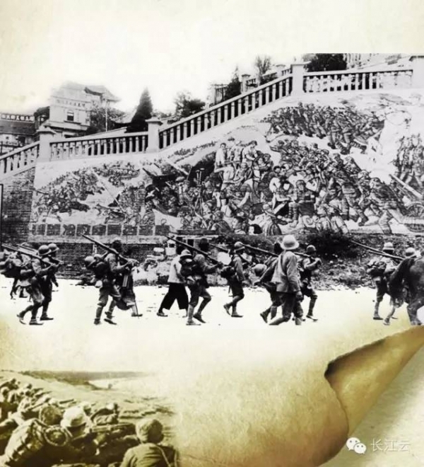 “当你走过武昌汉阳门的时候,即可以望见黄鹤楼壁上的巨大的全民抗战的壁画,据说这是抗战以来的第一幅大画。”1938年9月26日,共产党在武汉举办的《新华日报》如此报道。这壁画是周恩来实际领导、郭沫若任厅长的三厅所策划绘制的。1938年7月底,武汉保卫战进入最危急的阶段。为了打消日寇的嚣张气焰,田汉、李可染、王式廓等艺术家在武昌黄鹤楼城壁创作巨型壁画,以这种特殊的“精神武器”迎击日军,表达全民抗战的决心。这幅大型壁画问世不久,日寇就占领了武汉。照片上的日军从黄鹤楼下走过,他们的内心在那一刻也在颤抖。