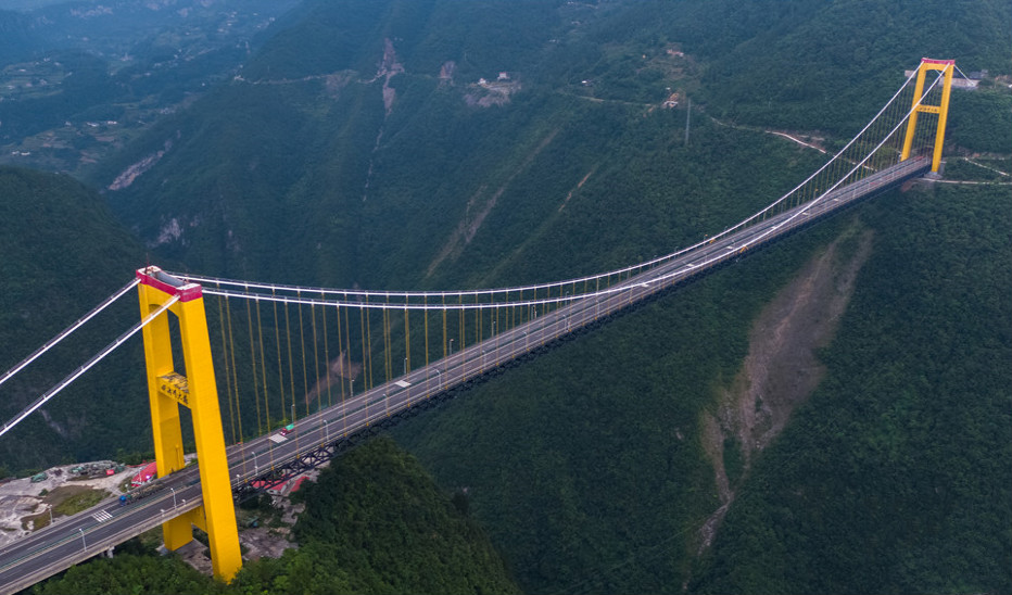 四渡河大桥地处湖北宜昌与恩施交界处,位于湖北巴东县野三关镇四渡河,是沪渝高速公路控制性桥梁工程,是目前中国在深山峡谷里修建的全球最长悬索桥。