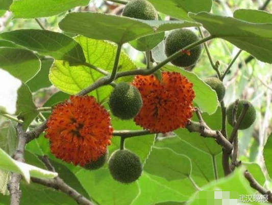 据了解,春天三四月,构树会开花,雌花挺好看,有些像漂亮的合欢花。雄花丑一些,有点像杨树絮。到了八九月,等花落了,构树就开始结果子,最初是一颗颗绿油油的小青果,慢慢地成熟为红色果子。