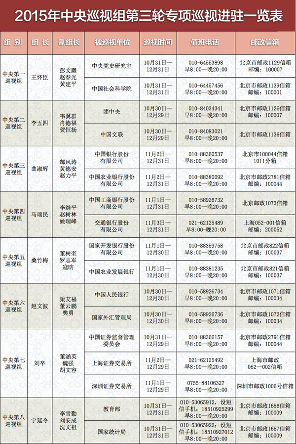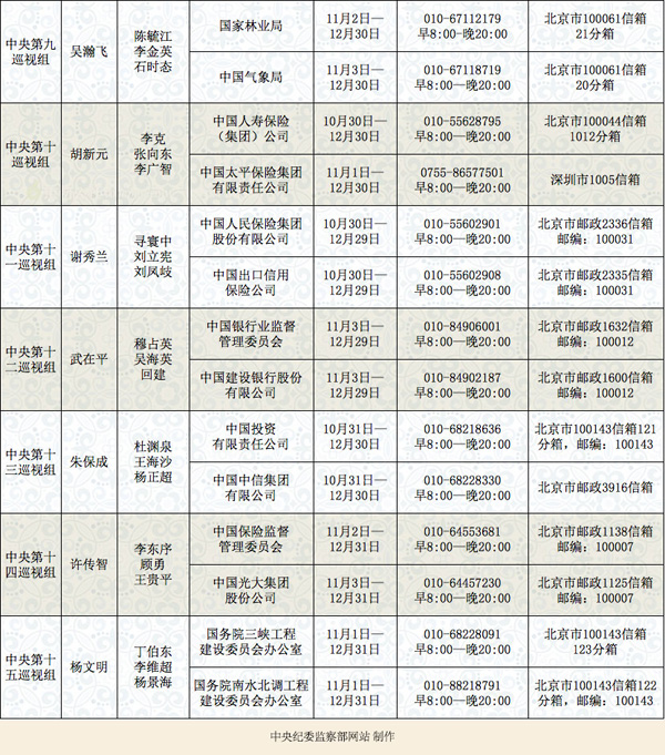 根据中央统一部署,中央巡视组近日陆续进驻国务院三峡工程建设委员会办公室、国务院南水北调工程建设委员会办公室、中国气象局、国家林业局、中国银行业监督管理委员会、中国保险监督管理委员会、国家开发银行股份有限公司、中国光大集团股份公司、中国农业发展银行、中国工商银行股份有限公司、中国农业银行股份有限公司、中国银行股份有限公司、中国建设银行股份有限公司、交通银行股份有限公司、中国太平保险集团有限责任公司、上海证券交易所、深圳证券交易所等单位开展专项巡视工作。