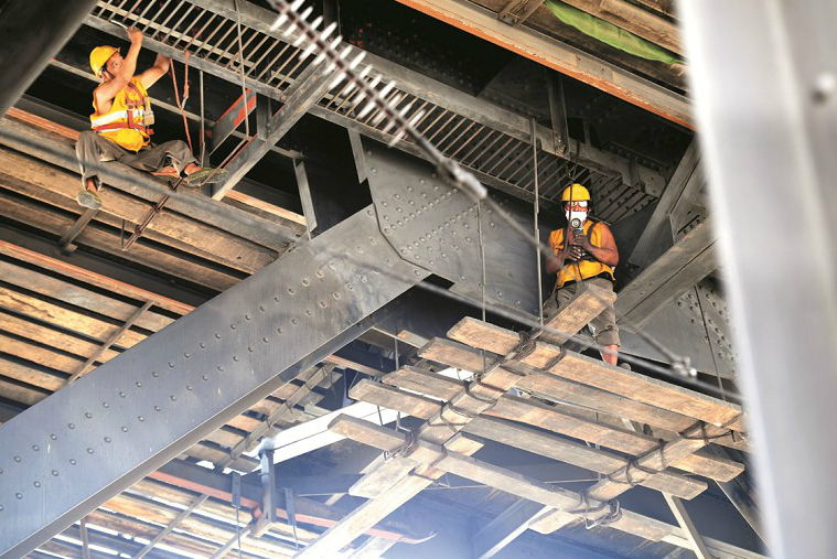据介绍,由于风雨的侵蚀,大桥钢梁会产生锈迹、锈蚀。每年夏秋季,有关部门都会对长江大桥进行周期性大修,对大桥部分钢梁进行冲洗、打磨、涂漆,对锈蚀区域进行喷砂除锈。今年是长江大桥建成60周年,加上国庆、中秋双节在即,施工人员正在抓紧时间,精心对大桥进行“美容”。