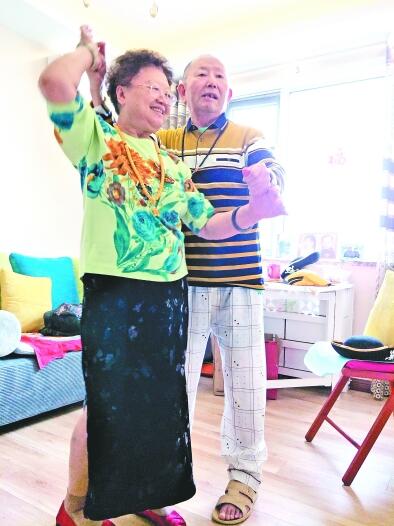 老两口在直播中随着音乐跳舞。记者石伟摄