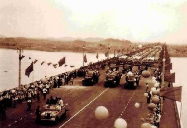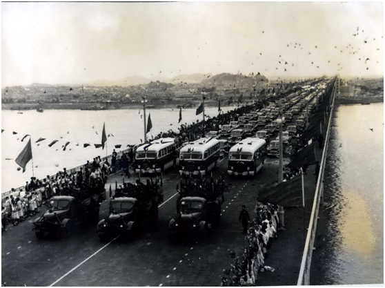 半个小时后,李富春又来到武昌岸桥面为公路通车剪彩。这儿更是一片欢乐的海洋。天空上升起了无数的彩球与和平鸽,三辆解放牌卡车满载着“祖国的花朵”——少先队员开道前行,象征着祖国的未来充满希望。后面是几百辆大小汽车组成的车队,在那汽车还不是很多的年代,同时出现这么多的轿车、客车、卡车,也是蔚为大观,更令我们这些孩子惊喜无比。车队后面呢,是十二条龙灯、十头狮灯、十只采莲船,它们舞动着,腾跃着,扭动着,一路锣鼓喧天。数万观礼的群众跟在它们的后面,一路欢歌笑语。听那声音,大都是在高喊: