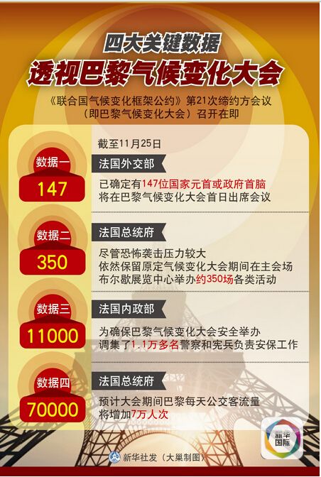 解读:截至11月26日,147国元首或政府首脑确认出席巴黎大会,167国提交国家自主贡献文件,195国和欧盟将派代表团与会。这样广泛的参与度,对国际社会协同能力构成巨大考验。中方一贯积极参与公约框架下有关谈判,致力于推动构建公平合理、合作共赢的全球气候治理体系。但气候协议需要全体参会方的认可,巴黎谈判能否成功,不由某个或某几个大国说了算,而将是世界各国共同努力的结果。