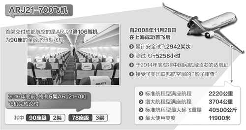 首架ARJ21-700为全经济舱布局,共90座,由“双机长”+“双副驾”的黄金组合执飞。未来5至6年,30架ARJ21-700将全部到位。据庄浩刚介绍,该公司已先后培训飞行、航务、机务和乘务人员200余人次,并取得相关证书,制订了18项保障方案。