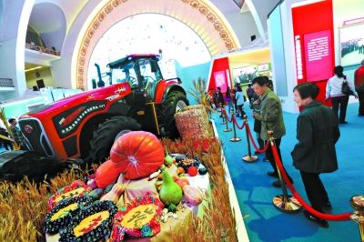 “砥砺奋进的五年”大型成就展上,“东方红-LW4004”400马力重型拖拉机吸引了不少参观者驻足观看。记者 方非摄