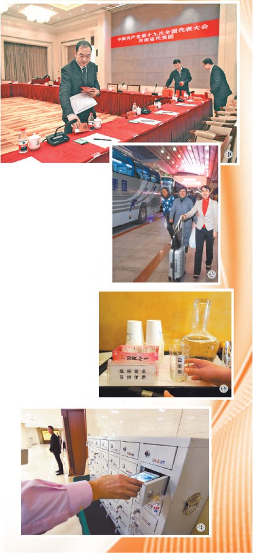 图①:10月20日上午,工作人员在布置河南代表团会场。会场设施简朴、用品简洁,不摆花草,一杯清茶、一瓶普通矿泉水、三页稿纸,会风清新。