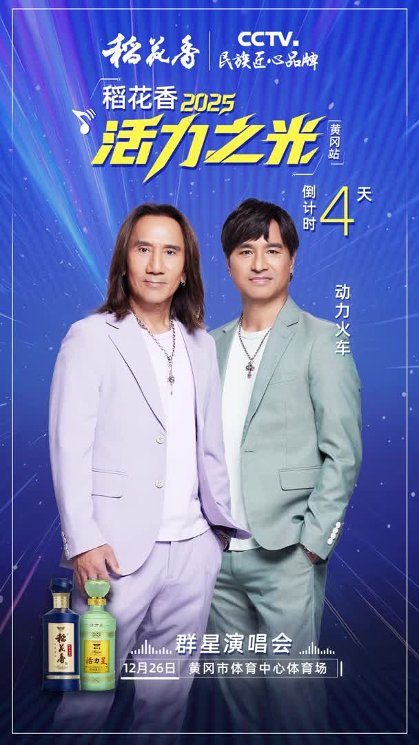 倒计时4天!动力火车组合邀你一起“追光”,活力之光·稻花香2025群星演唱会(黄冈站),黄冈市体育中心体育场,不见不散!