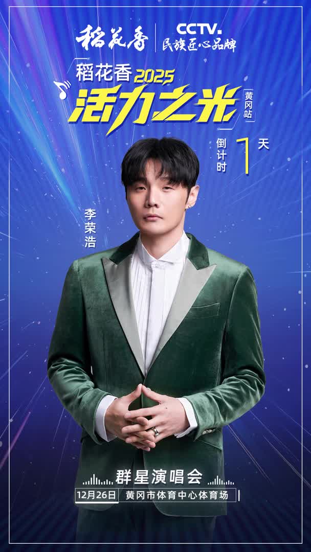 倒计时1天!李荣浩邀您来看活力之光·稻花香2025群星演唱会(黄冈站),黄冈市体育中心体育场明晚不见不散!